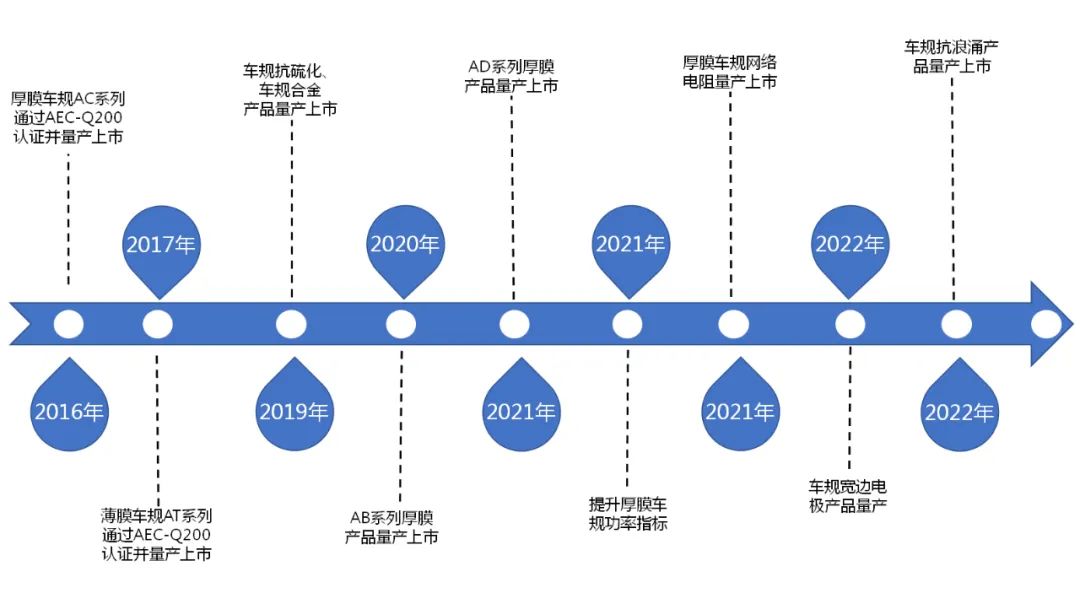 近年來,公司持續(xù)拓展汽車電子市場規(guī)模,用技術(shù)創(chuàng)新賦能汽車產(chǎn)業(yè),從汽車電子客戶產(chǎn)品設(shè)計前端導(dǎo)入,形成厚膜、合金、薄膜三大技術(shù)平臺,產(chǎn)品技術(shù)成熟穩(wěn)定,在高功率、高精度、高壓、耐高溫、高阻值等性能方面處于國內(nèi)領(lǐng)先水平。公司于2016年建成國內(nèi)第一條車規(guī)電阻生產(chǎn)線,目前,公司車規(guī)系列電阻產(chǎn)品齊全,全線產(chǎn)品均已通過AECQ-200測試,并與國內(nèi)多家汽車電子、動力電池配套廠家客戶建立了戰(zhàn)略合作關(guān)系。