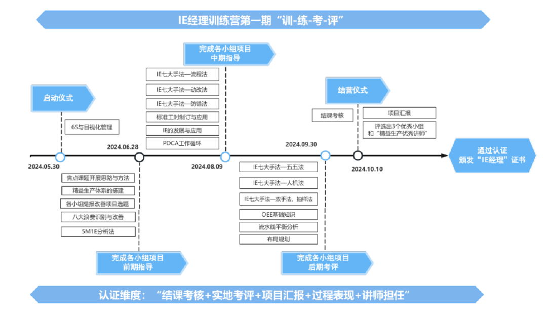 本期訓(xùn)練營以“極致降本”為項(xiàng)目主題開展“小組行動學(xué)習(xí)”,將對公司內(nèi)部9個單位63名學(xué)員開展為期6個月、涵蓋17門課程的培訓(xùn)。通過課堂培訓(xùn)+課后實(shí)練+知識考核+結(jié)營評審(即“訓(xùn)-練-考-評”)四個環(huán)節(jié),從“結(jié)課考核、實(shí)地考評、項(xiàng)目匯報、過程表現(xiàn)、講師擔(dān)任”五大維度認(rèn)證IE經(jīng)理,最終評選出3個優(yōu)秀小組和“精益生產(chǎn)優(yōu)秀講師”,給予通過考核的學(xué)員頒發(fā)“IE經(jīng)理”公司認(rèn)證證書。
