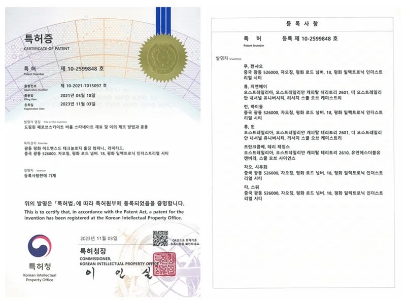 近日,風(fēng)華高科獲得一項(xiàng)韓國授權(quán)發(fā)明專利《一種摻雜鈣鈦礦錫酸鋇材料及其制備方法與應(yīng)用》,該專利的日本同族專利也于本年獲得了授權(quán)。至此,風(fēng)華高科已獲得12件國外授權(quán)發(fā)明專利。