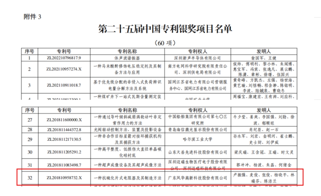 向新而行|風(fēng)華高科抗硫化電阻專(zhuān)利獲第二十五屆中國(guó)專(zhuān)利銀獎(jiǎng)