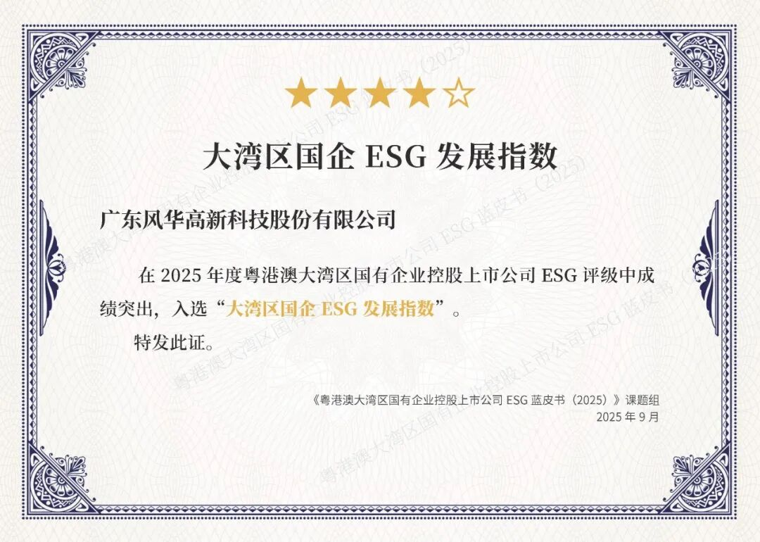 灣區(qū)聯(lián)動(dòng)聚合力,同心同向同發(fā)展。9月5日,在“第五屆國企社會(huì)價(jià)值論壇暨ESG中國?粵港澳大灣區(qū)企業(yè)社會(huì)責(zé)任發(fā)布會(huì)”上,風(fēng)華高科連續(xù)三年躋身“大灣區(qū)國企ESG發(fā)展指數(shù)”榜單;公司實(shí)踐案例《堅(jiān)定深化高效自主創(chuàng)新,勇做科技自立自強(qiáng)排頭兵》入選《粵港澳大灣區(qū)國有企業(yè)控股上市公司ESG藍(lán)皮書(2025)》。這兩項(xiàng)榮譽(yù)共同彰顯了公司在ESG體系建設(shè)與可持續(xù)發(fā)展方面的標(biāo)桿地位。
